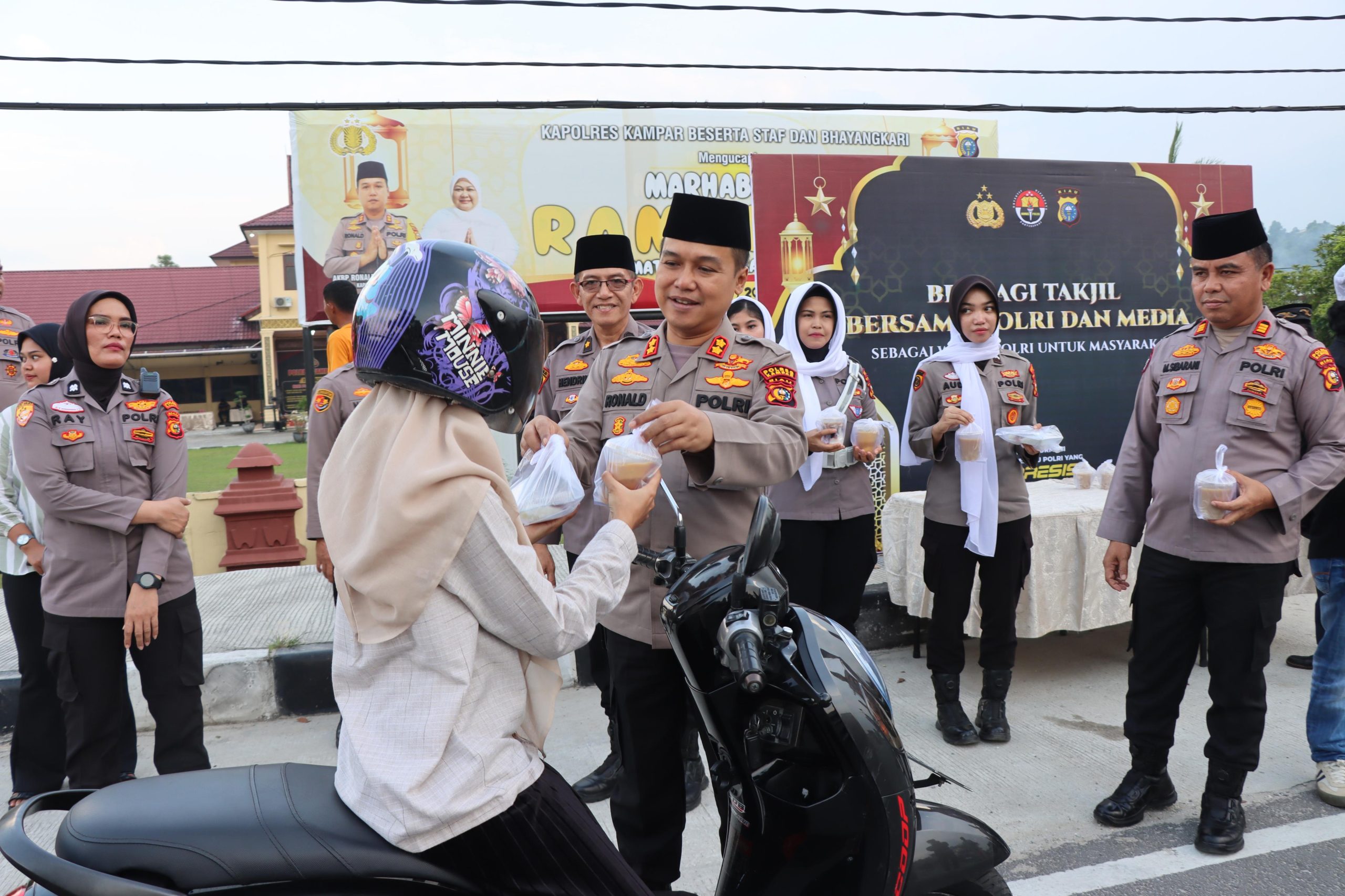Sedangkan di tingkat Polres Kampar, Kapolres Kampar AKBP Ronald Sumaja didampingi Waka Kompol Andi Cakra Putra dan pejabat utama di jajaran Polres Kampar langsung memimpin pembagian takjil kepada masyarakat yang melintas di depan Mapolres Kampar.