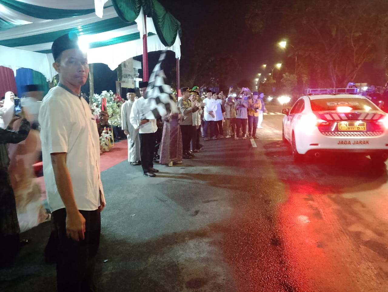 Bupati Kampar H Ahmad Yuzar setelah memberikan sambutan langsung melepas peserta Pawai Takbir yang diawali dengan pengibaran bendera petaka sebagai tanda pelepasan secara resmi.