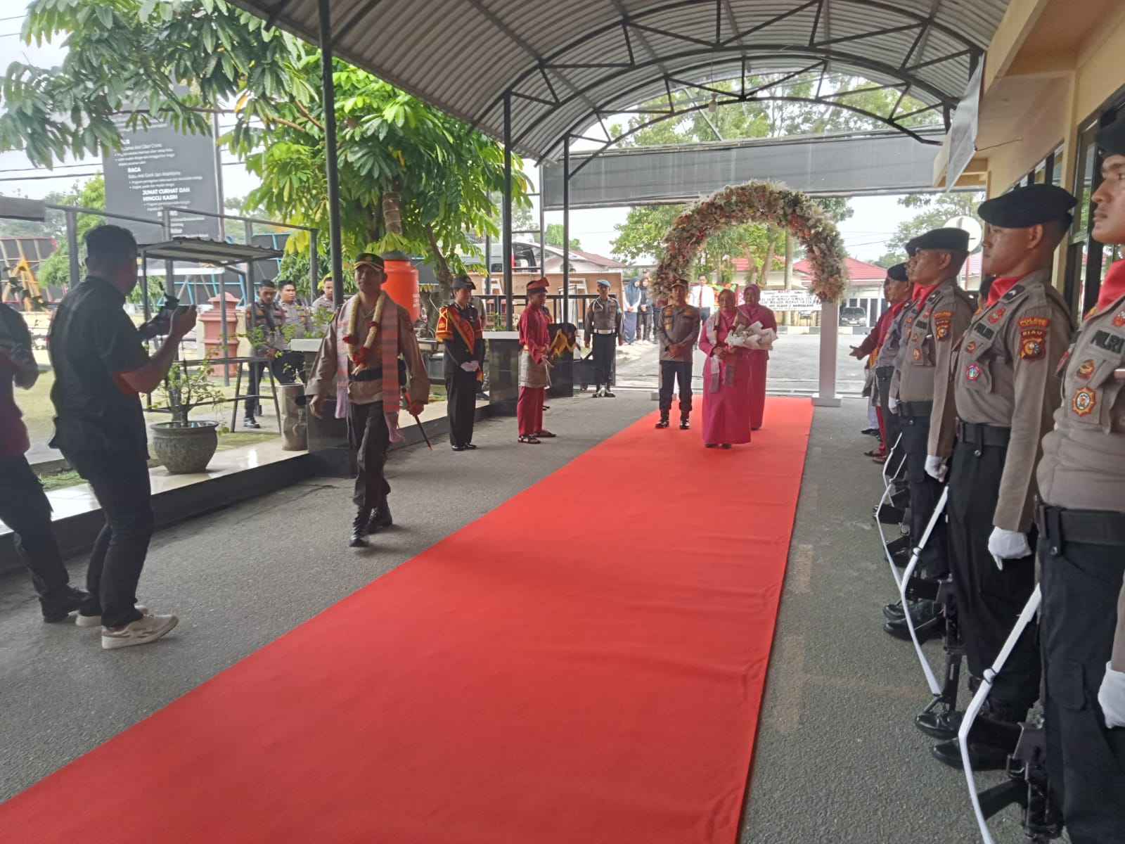 Upacara Farewall ini diawali dengan penyambutan dengan pengalungan bunga dan pemasangan selempang oleh anak didik dari TK Bhayangkari Bangkinang.