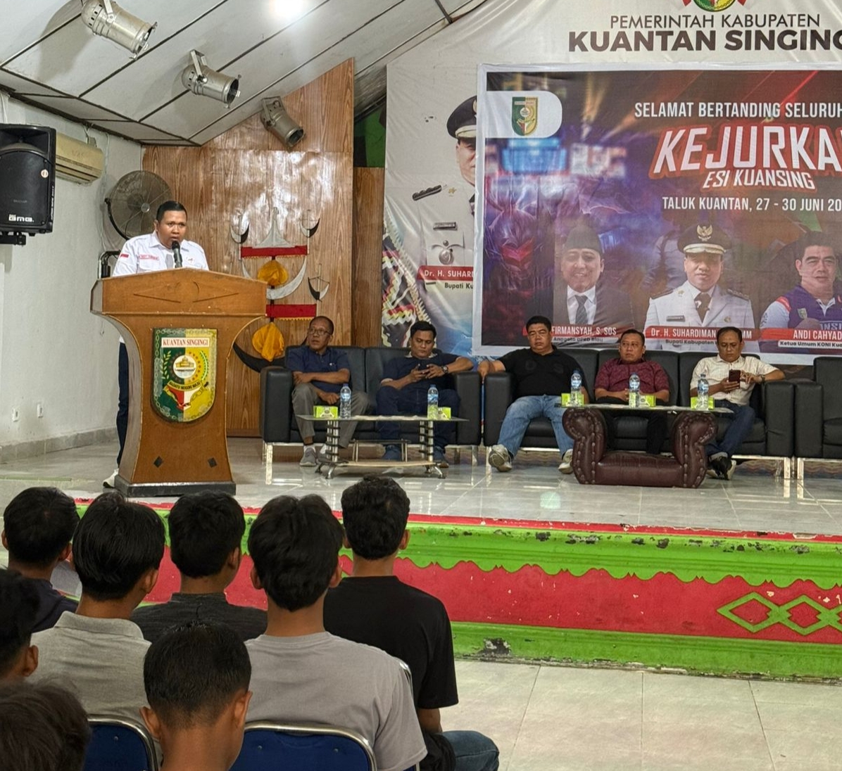 Hadir anggota DPRD Riau Ade Firmansyah, Ketua KONI Kuansing Andi Cahyadi, Ketua Pengcab ESI Kuansing Rocky Ramadani, pengurus KONI Kuansing dan ratusan perserta, bertempat di gedung Narosa Teluk Kuantan, Jumat, (27/6/2025).