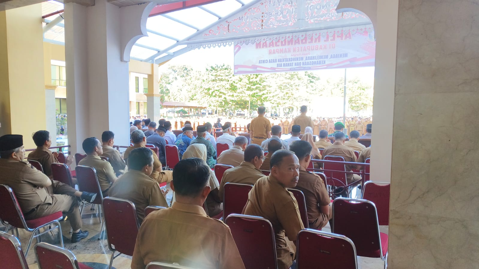 Apel Kebangsaan dipusatkan di Lapangan Upacara, Kantor Bupati Kampar, Jalan Panglima Khotib, Kelurahan Langgini, Kecamatan Bangkinang Kota, Kabupaten Kampar, Senin (08/09/2025) pagi.
