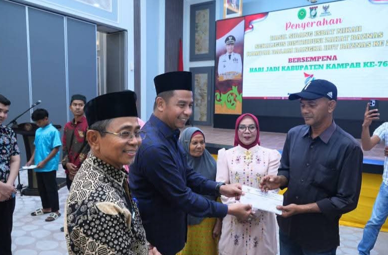 Jejak18news.com – Bupati Kampar Ahmad Yuzar.Sos.MT penyerahan hasil sidang isbat nikah sekaligus distribusi bantuan BAZNAS Kampar Bersempena Hari Jadi Kabupaten Kampar ke-76 di Aula Balai Bupati Kampar Bangkinang Kota, Sabtu (7/2).