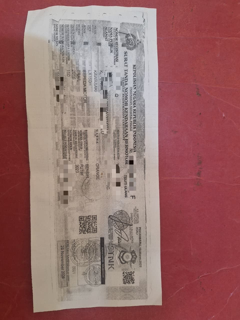 Dalam kasus ini, polisi mengamankan sejumlah barang bukti berupa satu buah kunci kontak sepeda motor Kawasaki LX150H warna orange, satu lembar fotokopi STNK, serta satu lembar fotokopi BPKB kendaraan tersebut.
