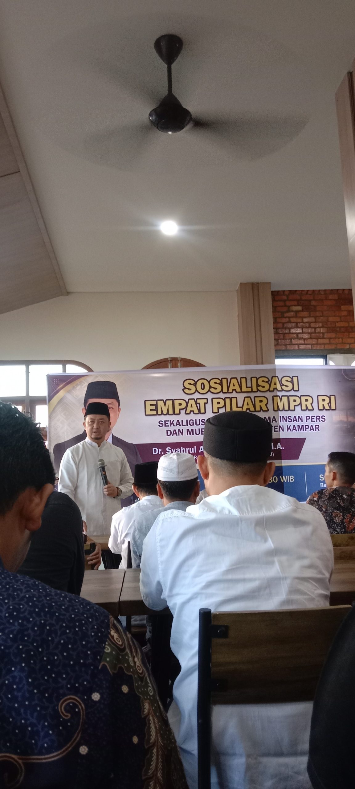 “Alhamdulillah hari ini kita bisa melaksanakan kegiatan Sosialisasi Empat Pilar MPR RI bersama dengan Insan Pers dan Mubaligh di kabupaten Kampar,” ucapnya.